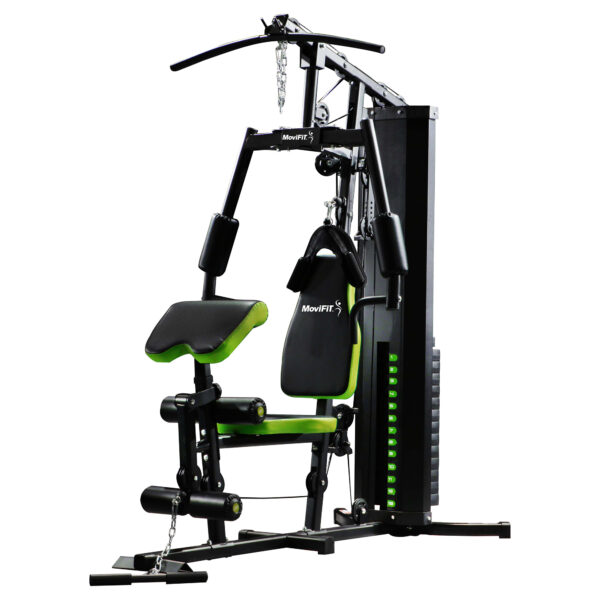 Multifuerza 1182 marca MoviFit con predicador, polea media y cubierta de pesas. Pila de pesas recubiertas en plástico de 150 lbs. Cables de calidad de aviación con resistencia máxima de 2000 lbs. Asiento, espaldar y cojín predicador contorneados y con acolchado grueso para mayor comodidad. Incluye los siguientes accesorios: Barra Larga, barra corta, correa sencilla, tobillera, soga tríceps y cadena. Mas de 15 ejercicios básicos + variaciones: presión de pecho, vuelos pectorales, polea alta espalda, polea media para abdomen y tríceps, predicador de bíceps, remo sentado, extensión y flexión de piernas, trabajo de cadera, piernas y glúteos con tobillera y muchos mas.